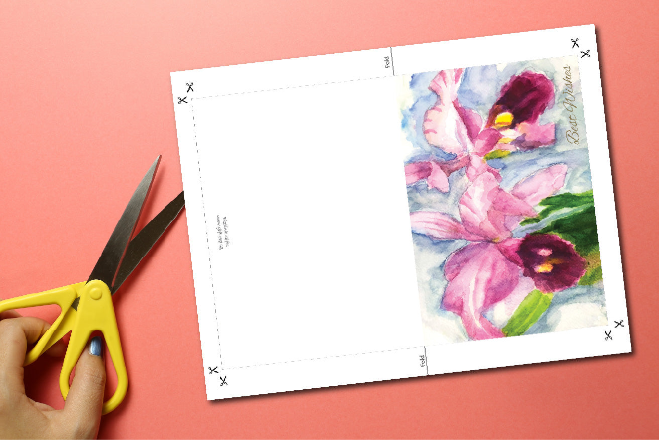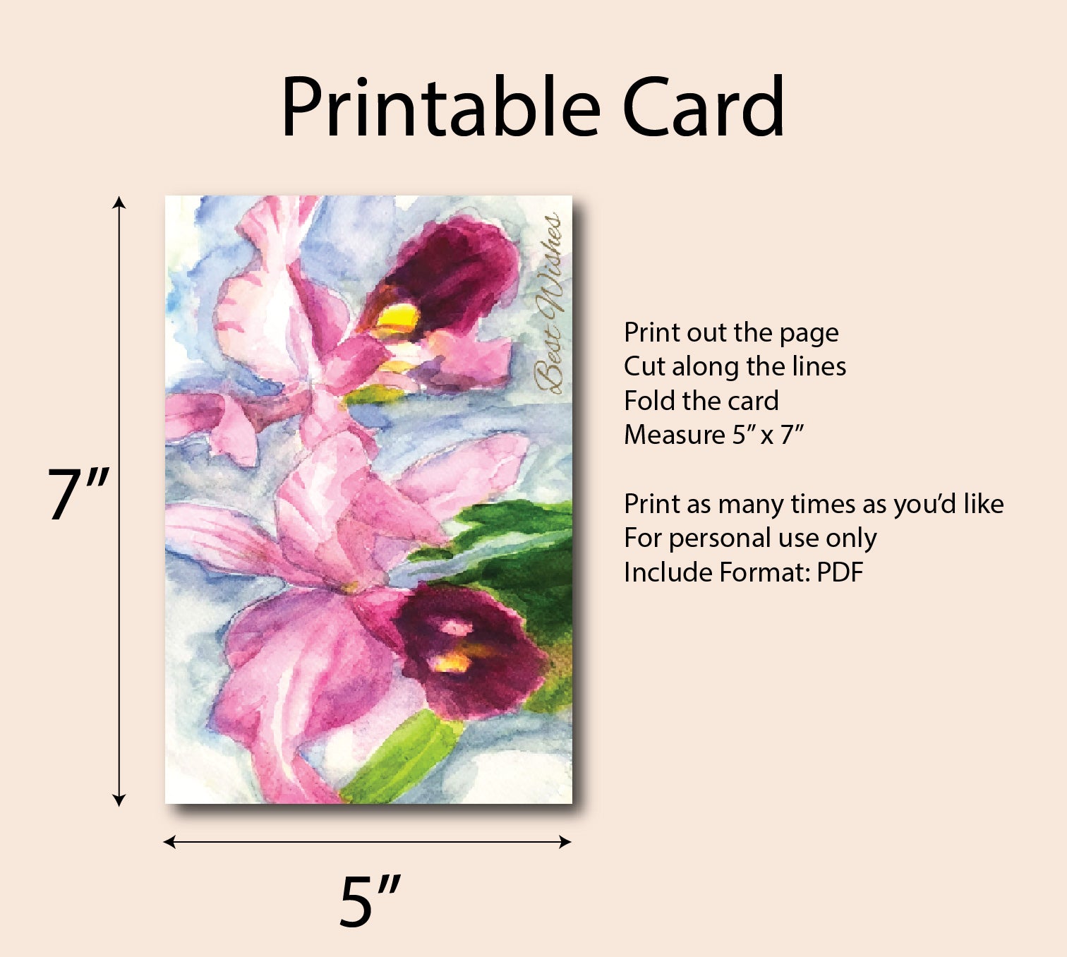 Once you have downloaded the PDF, you can print on either a standard 8.5"x11" piece of paper or use card stock paper for a more refined look. Cut along the solid lines and then fold the paper in half, using the dotted lines as a guide. The finished card should measure 5"x7", and fits a standard A7 envelope.
