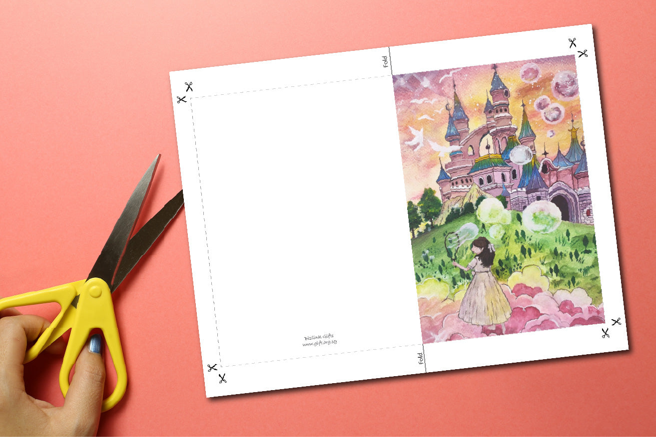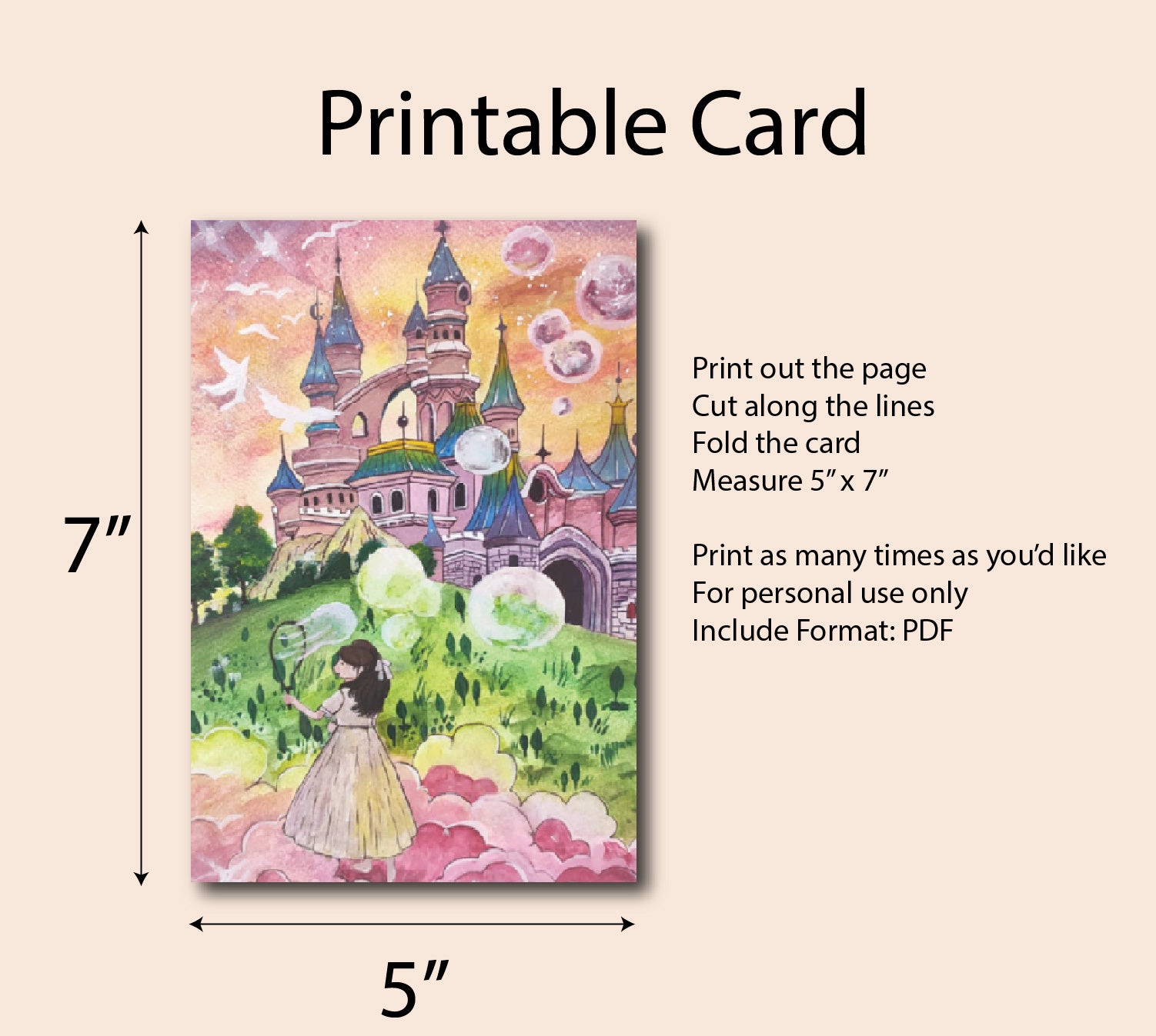 Once you have downloaded the PDF, you can print on either a standard 8.5"x11" piece of paper or use card stock paper for a more refined look. Cut along the solid lines and then fold the paper in half, using the dotted lines as a guide. The finished card should measure 5"x7", and fits a standard A7 envelope.