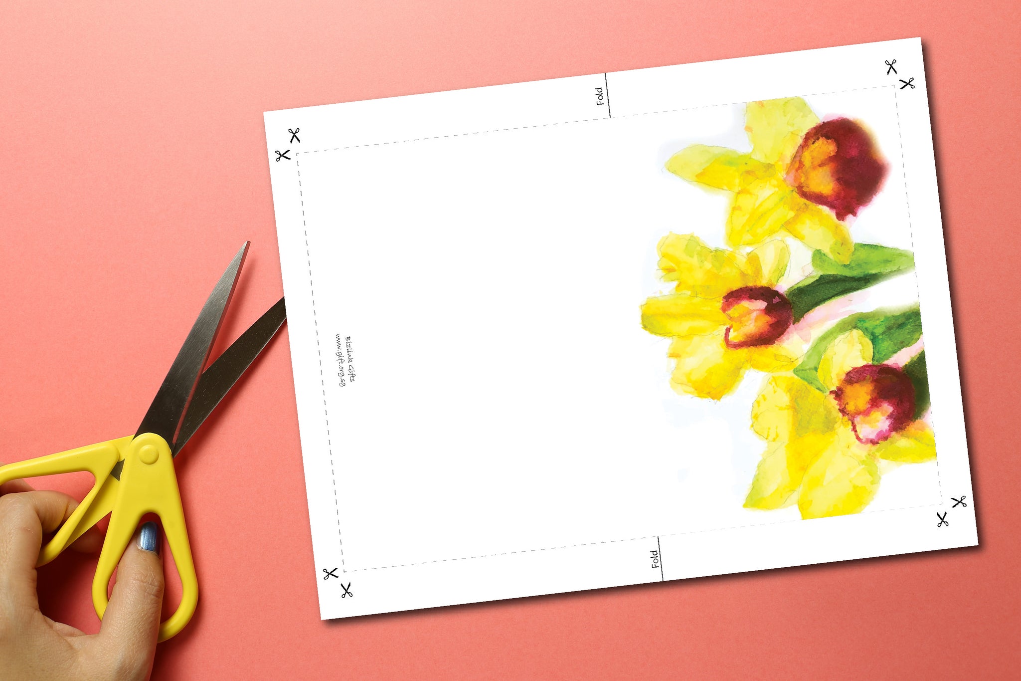 Once you have downloaded the PDF, you can print on either a standard 8.5"x11" piece of paper or use card stock paper for a more refined look. Cut along the solid lines and then fold the paper in half, using the dotted lines as a guide. The finished card should measure 5"x7", and fits a standard A7 envelope.